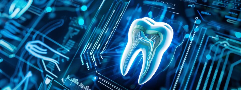 A dental clinic equipped with advanced technology features a computer screen displaying 3D designs of dental implants alongside X ray images of a patient's jaw, emphasizing precision in dental care.