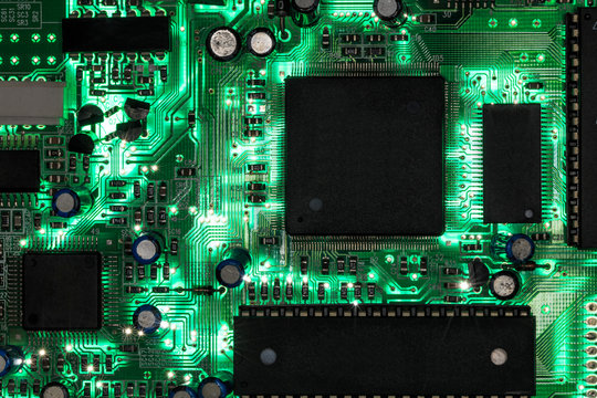 Closeup of Printed Circuit Board with  integrated circuits and many other passive electrical components.