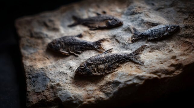 Ancient fish fossils embedded in rock preserving prehistoric marine life and detailed skeletal structures