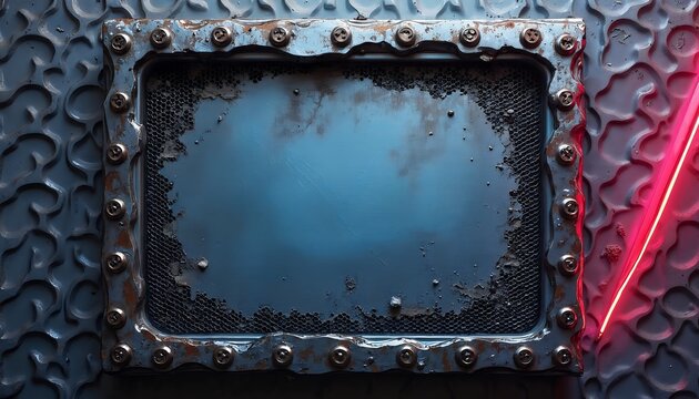 Grunge Metal Frame with Texture and Pink Neon Light Industrial Design