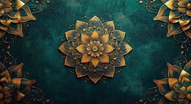ornate golden mandala medallion with lotus floral corner ornaments on textured teal background, elegant serene meditative decorative design