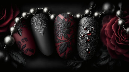 Elegant black gift box with pink satin ribbon and dried rose on textured stone background. Luxury Valentine's day gift concept