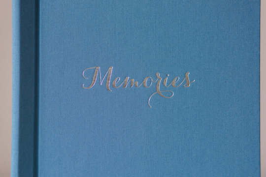 Closed photobook on white wooden table. Blue textile wedding album with silver embossing