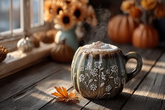 Steaming pumpkin-shaped mug of hot cocoa on a rustic wooden table with autumn decor scene