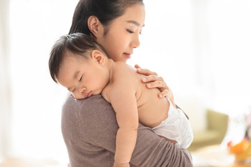 Portrait images of half African half Thai, 12-day-old baby newborn son, sleeping with his mother being held, to family and infant newborn concept.