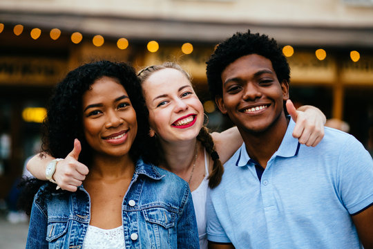 White blonde happy girl hugging and laughing with two best friends afro american couple having fun together. 2 multi-cultural and difference of cultures strong friendship concept.