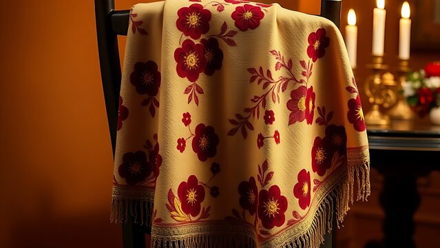 Spanish embroidered shawl with floral motifs in burgundy and gold, draped elegantly over a chair in warm candlelight.