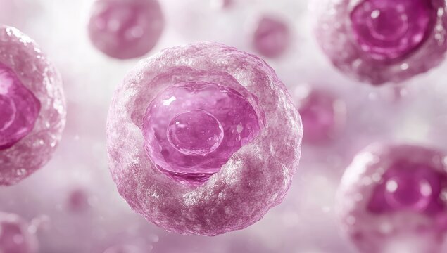 A 3D rendering of a human or embryonic stem cell under a microscope, undergoing cell separation through mitosis and meiosis. The cell division processes are depicted against a bright white-toned backg