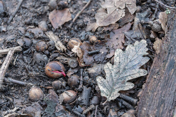 A germinating acorn from an oak tree, with its embryonic root burrowing into the soil and decaying leaf matter.