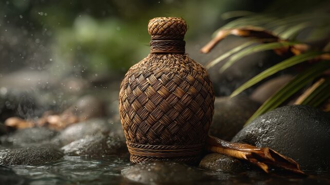 closeup botol arak bali dengan detail anyaman daun kelapa yang kering simpulsimpul tradisional terlihat jelas ditempatkan di atas batu alam dengan embun pagi ultra fokus dan tekstur tinggi