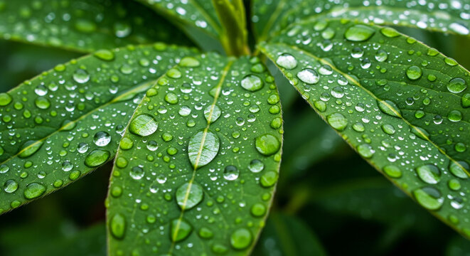 Close-up of vibrant green leaves with water droplets, nature's beauty