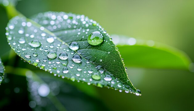 Lush green leaf glistening with dew drops in the morning sunlight, nature's beauty
