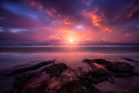Emerald Isle North Carolina Dusk Beach Scene: Crystal Coast Bogue Banks Waves, Clouds in Orange and Blue Dusk Light