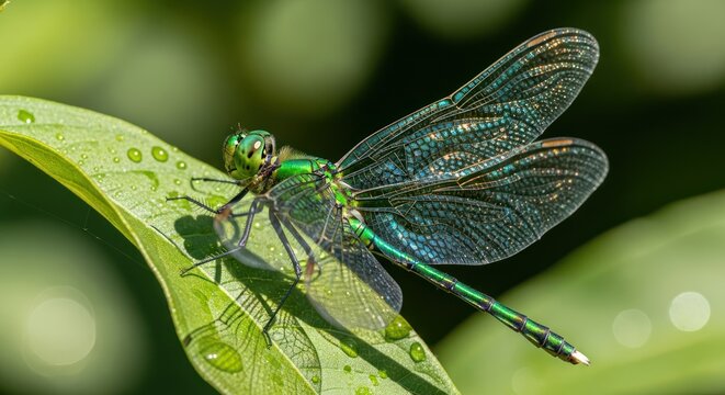 Emerald dragonfly resting on a wet green leaf in bright sunlight