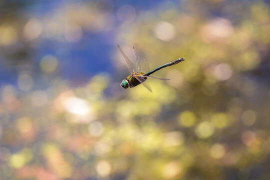 Close-up of a Tau Emerald Dragonfly flying.