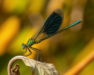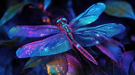 A vibrant dragonfly rests on a leaf