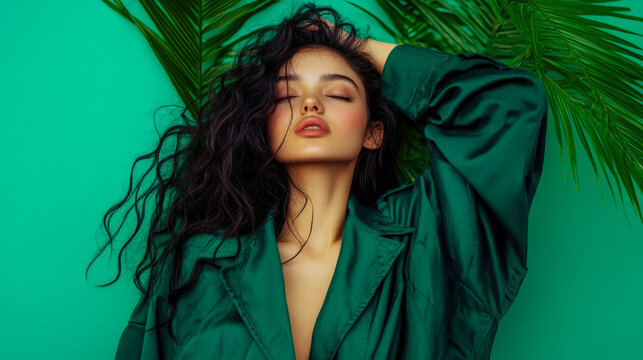Elegant young Asian woman in a stunning emerald green gown, posing in a grand hall. The rich colors and luxurious setting create a captivating image.