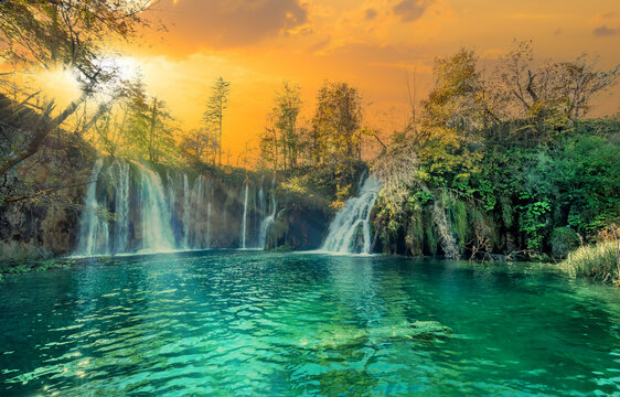 Panorama of the most beautiful places in Europe, Plitvice area of Croatia with emerald turquoise lakes and natural waterfalls illuminated at sunset
