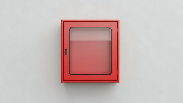 Red fire extinguisher cabinet mounted on a clean white wall, safety equipment for emergencies