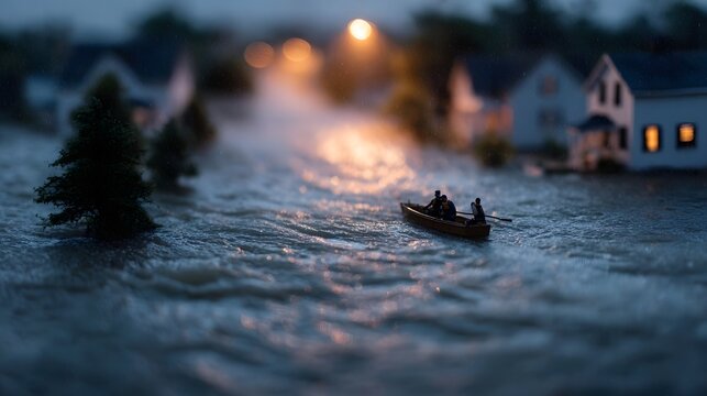 People evacuating flooded homes by boat during a nighttime emergency