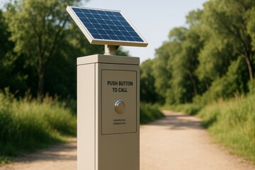 Solar-powered emergency call box with "Push Button to Call" text installed on nature trail pathway surrounded by trees in soft daylight background. Ai generative
