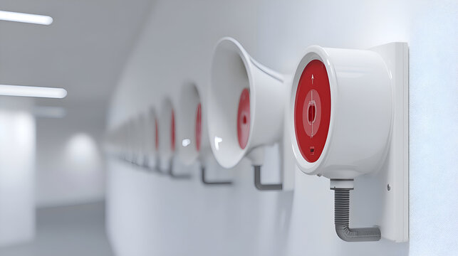 A blank white screen hangs on a textured wall next to a red emergency call box in a hallway.