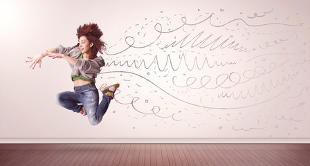 Pretty woman jumping with hand drawn lines and arrows come out