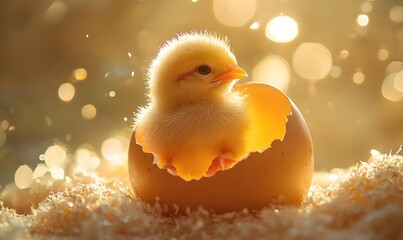 A fluffy newborn chick emerging from a cracked egg bathed in soft golden light