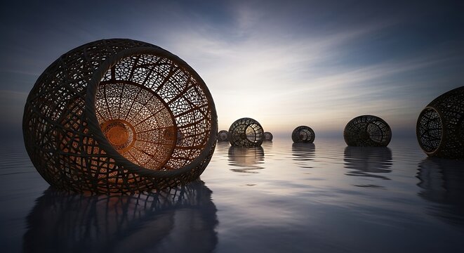 Mysterious ornate egg structures emerging from calm water