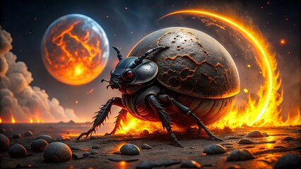 Giant insectoid creature emerging from a cracked egg on a fiery alien planet