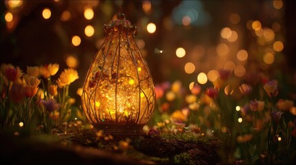 Tulip-shaped lantern emitting warm golden light in a fairy village