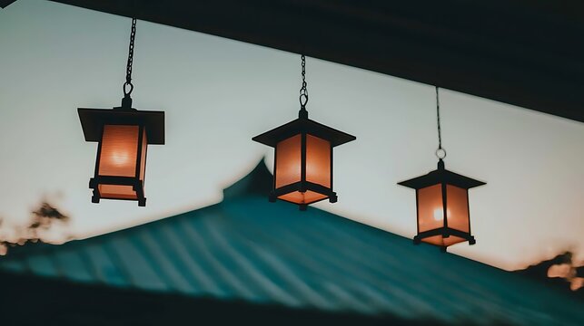Dark temple roof silhouette framed by hanging lanterns emitting a gentle warm light at twilight