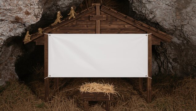 Christian holiday theme. The nativity of Jesus Christ. Rustic wooden crib inside a cave setting. Banner with space for text. Symbolic nativity depiction. Jesus as the meaning of the season. Savior,