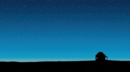 Lonely wooden barn silhouette on moonless midnight blue starry sky with single warm window light evoking quiet solitude and rural calm