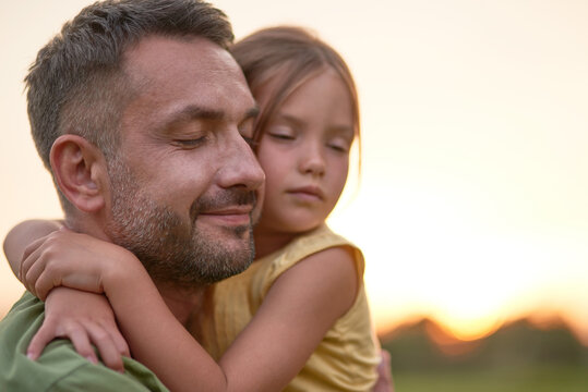 Close up shot of young father and adorable little daughter embracing each other, posing with eyes closed while spending time outdoors in the park on a summer day