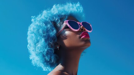 Vibrant woman with blue curly wig and pink sunglasses posing against a bright blue sky background exuding confidence and style.