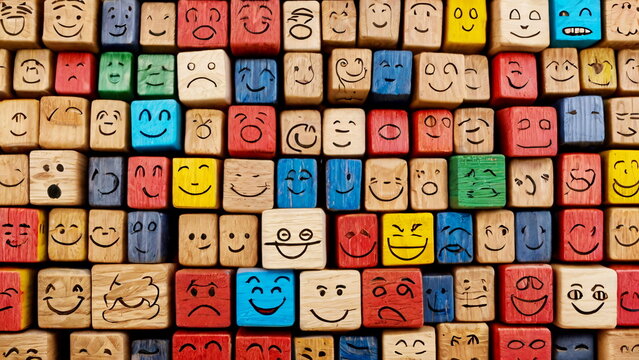 Different emotions drawn on colorful wooden cubes.