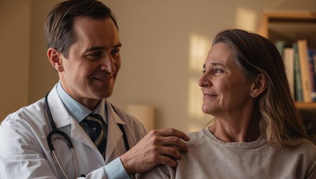 Smiling clinician placing hands on patient conveying empathy, trust, compassionate care
