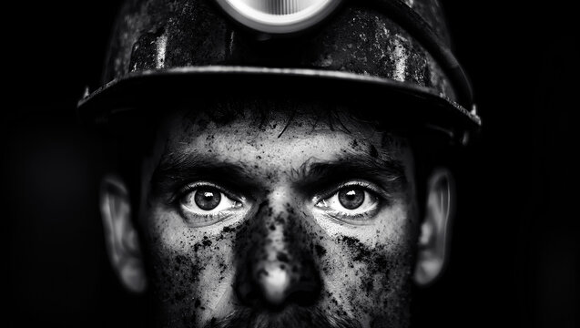 Black-and-white photo close-up of the face of a miner in a helmet with a lantern, stained with coal with emphasis on the eyes and details.