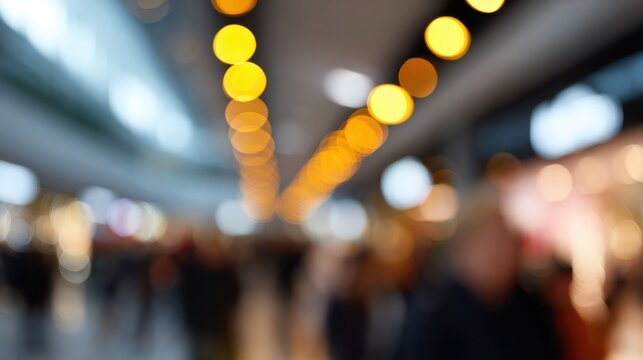 Abstract background of blurred lights and bustling activity in a large department store, holiday shopping. Excitement, busy. Festive.