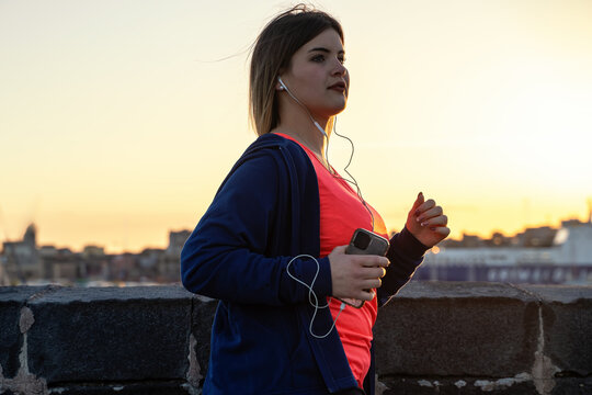 A confident, full-figured woman engages in her evening run, empowered by the city's twilight glow, celebrating body positivity and the joy of movement.