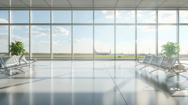 Interior of airport terminal with panoramic window and airplan