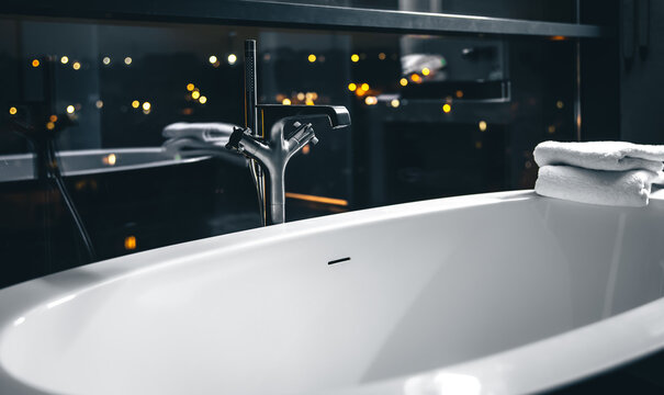 a hotel bathroom with a bathtub, sink, towel rail ladder, podium, and beige concrete floor. Panoramic window showcasing the tropics. Empty wall with mockup copy space.