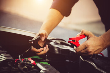 Action of a technician hand is using an emergency clamping kit to clamp on positive polar for jumping the 12V car battery. Transportation troubleshooting and reparing scene, close-up.
