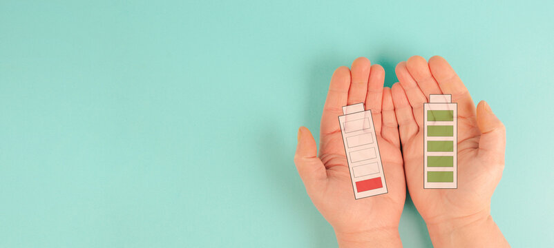 Exhausted by stress against healthy positive lifestyle, work life balance, burnout, low energy, hand with an empty and a full battery