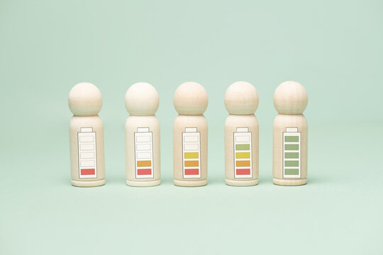 Coworkers chatting over coffee and pastries in office kitchen with battery icons overlay