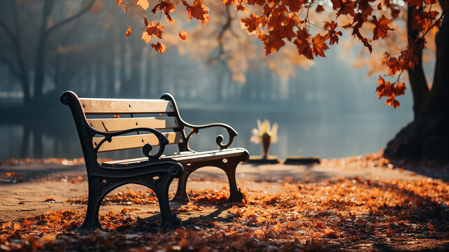 Serene sunrise over a still lake, with a park bench at the water's edge. Misty morning light reflects on the water's surface. Lush trees line the shoreline, creating a peaceful ambiance