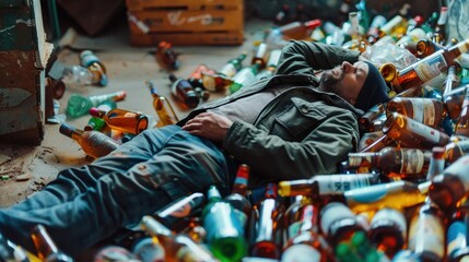 Empty beer glass with bottle caps and bottles on grey concrete,after party