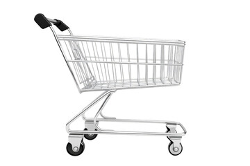 A shopping cart stands empty waiting in the aisle of a bustling supermarket filled with colorful products.