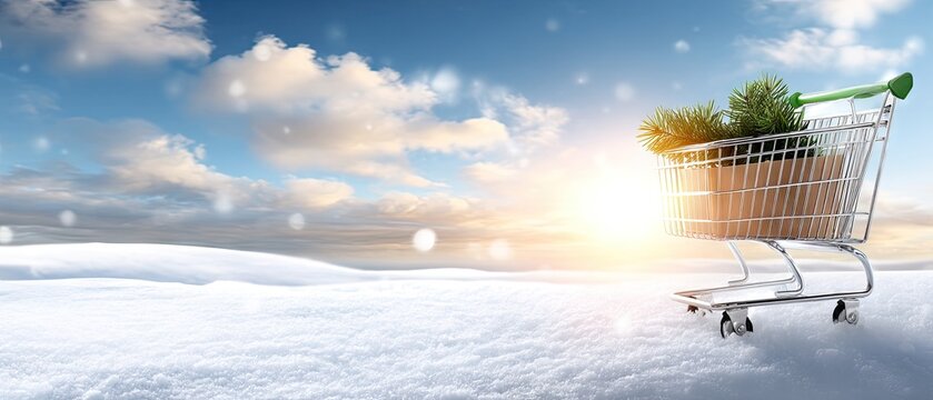 Shopping cart sits on icy surface with snow and sky above during winter daylight in an empty area suited for text